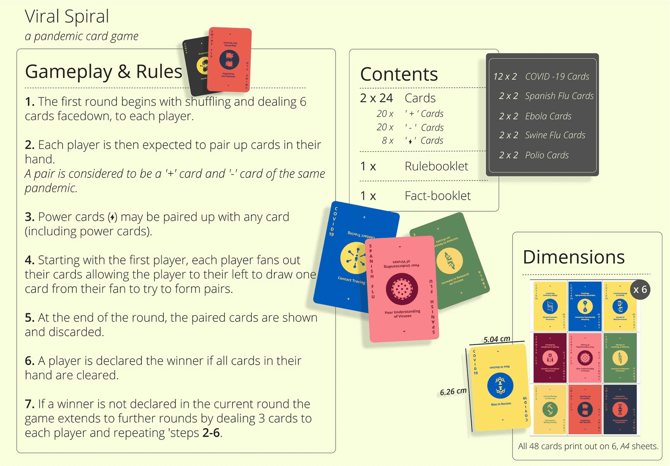 We designed 48 unique cards covering several factoids about pandemics including historical ones besides safety protocols. The entire deck can be printed on 6 A4 sheets and is available to play even today.